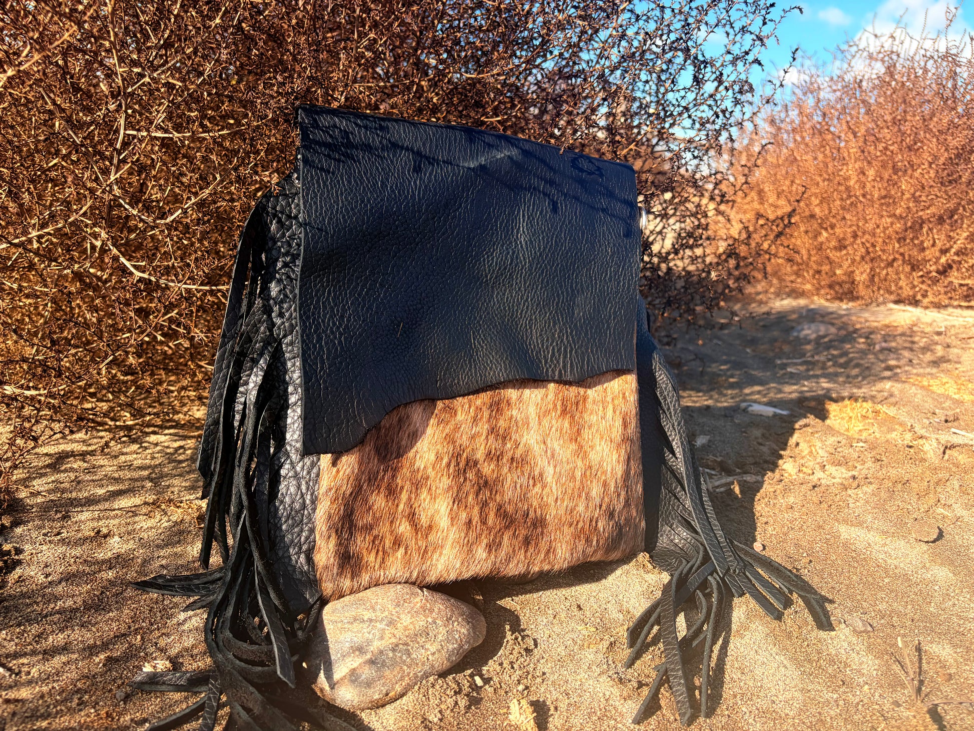 This bag is made from natural hair-on hide and finished with a soft black leather flap that gives it a smooth, minimal look. Side fringe adds a bit of movement, and gives a classic western look to any outfit.